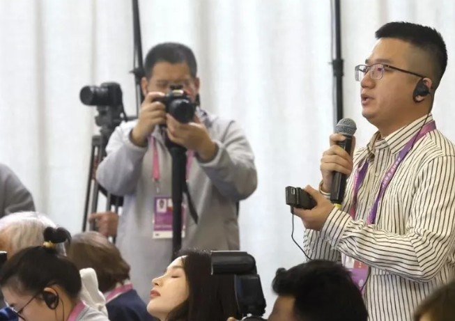 王君宝在第九届亚冬会新闻发布会采访现场提问。