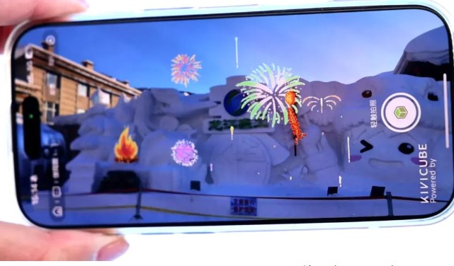 “为了增强雪雕的互动性,我们在后期制作了小程序,用手机扫描小程序再对准雪雕,手机里就会呈现烟花、篝火等动态场景,可供游客拍照和录像,带来不一样的体验感。”正在向游客讲解创意雪雕的王海峰介绍说。当游客拿出手机扫描雪雕旁的二维码后,神奇的一幕就此上演。屏幕上瞬间呈现出燃放烟花爆竹的绚烂景象,五彩斑斓的烟花在雪雕上空绽放,伴随着逼真的音效,仿佛置身于热闹的节庆现场。