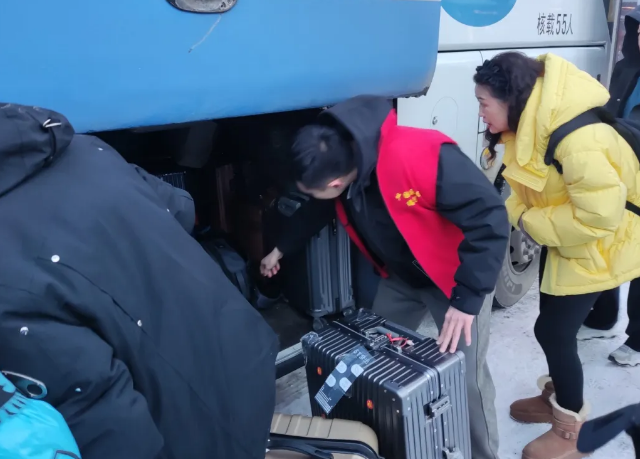 为了方便游客找到志愿者,景区为志愿者们配备了统一的红色志愿马甲和志愿者服务标志。从售检票大厅到游客服务中心,从羊草山到雾凇岭,从雪谷穿越到雪谷大舞台,只要游客有需要,就有志愿者们奔忙的身影。提供咨询、引导游客、维护秩序、失物招领、设施维护……志愿者们用温暖的笑容驱散了冬日的寒冷,用真诚服务赢得了各地游客的赞誉。 “您好,请往边上让一让,别碰到大家……”一辆辆满载游客的观光车陆续驶进中国雪谷景区,看到一位游客一手吃力地拉着行李箱一手牵着孩子,志愿者陈峥赶忙走上前。“您好,欢迎来到中国雪谷,我是咱们当地的志愿者,我们可以免费帮您托运行李。” “景区的工作人员真的太热情了,在这里天气虽然冷了些,但我们的心真的很温暖!”到达了预订的民宿,广西游客王女士接过行李后感激地说。“我们每天主要负责帮助游客托运行李,游客大老远来一趟不容易,能为他们服务,就算是累点也值!”陈峥边说边拉着爬犁走向换乘站点去迎接游客。