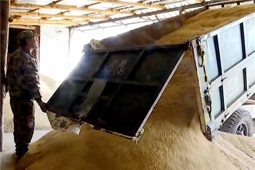 收割完的稻谷装入农用车后就被拉到各家的厂棚储存,等待销售,此时李令军的厂棚已经堆放了满满的稻谷,小型挖掘机正在对稻谷进行攒堆,看着满仓的收获李令军的脸上挂满了笑容。 东京城局英山经营所 水稻种植户 李令军 我一年靠着种水稻生活非常美满,今年种了二十三四晌地,有的不懂种植户我就帮助帮助他们,在我的带动下经营所已经有十多户种水稻的了。