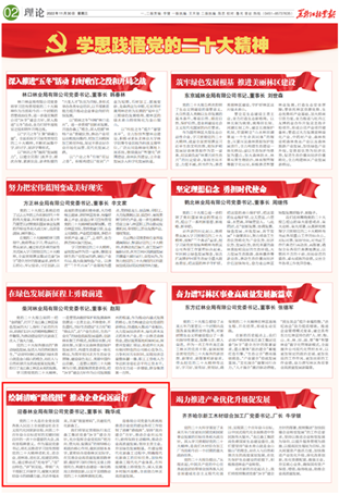 迎春林业局有限公司党委书记、董事长 鞠华成 我们将坚定贯彻执行龙江18新利(中国)集团党委“28字”建企方针,充分发挥企业党组织“把方向、管大局、促落实”的领导核心和政治核心作用,做到原原本本学,紧密结合迎春林区实际学,在完善企业高质量发展思路举措、做好学习研讨转化文章上持续用力、构建生态建设一体化格局上持续创新,以实干实绩推动党的二十大精神落地见效。
