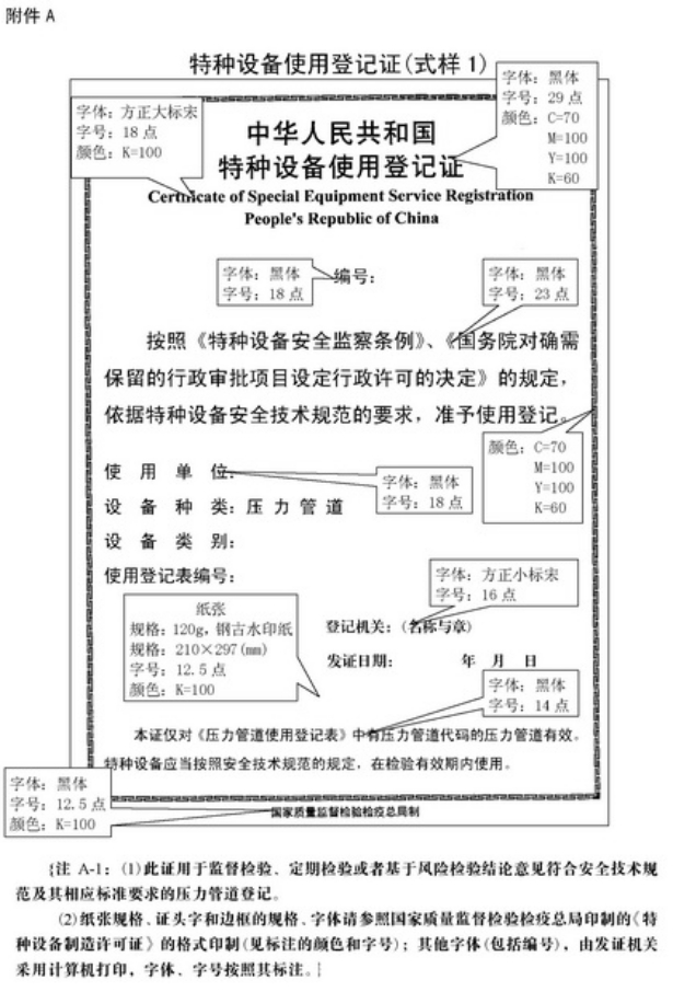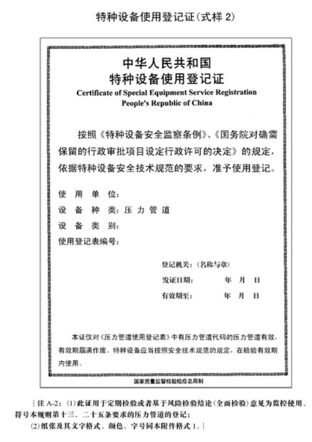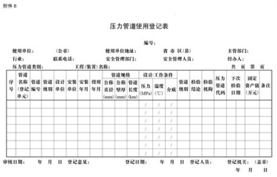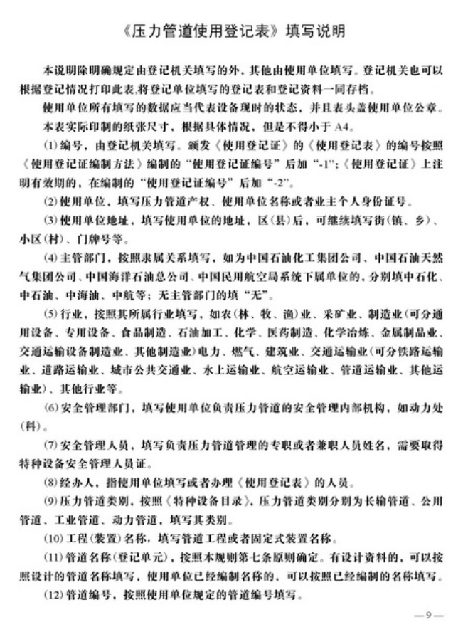 压力管道使用登记管理规则 总述 2009年8月31日,国家质检总局批准颁布了《压力管道使用登记管理规则》,该规则自2009年12月1日起施行。2003年7月13日由国家质检总局颁发的《压力管道使用登记管理规则(试行)》同时废止。本规则针对使用登记过程全面检验工作遇到的技术处理及检验工作推进所遇到的问题,同时简化了使用登记的要求。 第一章 总 则 第一条 为了规范压力管道使用登记管理,根据《特种设备安全监察条例》、《国务院对确需保留的行政审批项目设定行政许可的决定》,制定本规则。 第二条 本规则适用于《特种设备安全监察条例》规定范围内的压力管道的使用登记管理。 第三条 压力管道使用单位、产权单位、个人业主(以下统称使用单位)应当按照本规则的规定办理管道使用登记,领取《特种设备使用登记证》(统一格式,见附件A,以下简称《使用登记证》)。 第四条 国家质量监督检验检疫总局负责办理跨省、自治区、直辖市的长输管道的使用登记,省级质量技术监督部门负责办理本行政区域内不跨省、自治区、直辖市的长输管道的使用登记,设区的市的质量技术监督部门(以下统称登记机关)负责办理本行政区域内公用管道、工业管道和动力管道的使用登记。 第二章 使用登记对象的划分 第五条 压力管道使用登记以使用单位为对象,使用单位根据压力管道的类别,即长输(油气)管道、公用管道、工业管道、动力管道,按照管辖部门或者工程(装置)等分别办理使用登记。 第六条 使用单位根据压力管道的类别,按照以下原则,分别填写1个或者若干个《压力管道使用登记表》(见附件B,以下简称《使用登记表》): (一) 长输(油气)管道按照管辖部门; (二) 公用管道按照区域 ; (三) 工业管道、动力管道按照工艺管道、公用工程管道等品种。 第七条 《使用登记表》按照压力管道名称,即登记单元填写。工业管道、动力管道、公用管道中的热力管道、门站和阀站内的压力管道的登记单元确定原则如下: (一)设计管线表编号从始端至终端的所有管段; (二)物流输送的形式,以物流从流出设备至流入设备之间的每条管道; (三)装置、系统形式,以装置和系统内、外进行划分,以装置和系统内(或者装置和系统外)每条管道; (四)工程编号。 长输管道以站和站之间的管道为登记单元;公用管道中燃气管道的登记单元可参照长输管道确定,也可采用工程编号为登记单元。 第八条 压力管道登记单元数量较少(一般不超过10个)的使用单位,可以只按照压力管道类别填报1个登记表。 第三章 使用登记程序 第九条 使用登记程序包括申请、受理、审核和发证。 第十条 新建、扩建、改建压力管道在投入使用前或者使用后30个工作日内,使用单位应当填写《使用登记表》(一式两份、附电子文档),携同以下资料向登记机关申请办理使用登记: (一)压力管道使用安全管理制度; (二)事故紧急预案(适用于输送易燃、易爆、有毒介质或者介质温度大于200°C 的压力管道); (三)压力管道安全管理人员和操作人员名单,列出姓名、身份证号、特种设备作业人员证件编号及其持证种类、类别和项目(下同); (四)安装监督检验机构出具的压力管道安装监督检验报告。 第十一条 登记机关在收到使用单位的申请资料后,对压力管道登记单元数量较少能当场审核的,应当当场审核,符合本规则规定的当场办理使用登记;不符合规定的,应当出具不予受理决定书。不能当场审核的,应当在5个工作日内将不予受理的决定书面通知使用单位,并且说明理由;需要进行现场核查的,其核查的时间除外。 登记机关应当自受理之日起在15个工作日之内完成登记,一次登记数量较多的可以在30个工作日内完成登记。 第十二条 监督检验、定期检验或者基于风险检验结论意见符合安全技术规范及其相应标准要求,满足使用登记要求的压力管道,登记机关应当对《使用登记表》中的每个登记单元编制压力管道代码(同一登记单元压力管道代码不变),《使用登记证》上应当注明《使用登记表》编号(编号编制方法见附件B的附录b)。 压力管道代码和使用登记证编号编制办法见附件C。 第十三条 定期检验或者基于风险检验结论意见为监控使用的压力管道,登记机关在《使用登记表》中的每个登记单元只编制(临时)压力管道代码,所颁发的《使用登记证》上注明有效期,此类压力管道应当严格在限制条件下监控使用。 第十四条 使用单位应当对办理使用登记时所提供的申请资料的真实性、准确性和可实施性负责,登记机关认为必要时可以组织核查组进行现场核查。 第十五条 核查组由特种设备安全监察人员、具有压力管道安全管理经验的专家和具有压力管道检验资格的检验人员组成。使用单位应当配合核查组的核查工作。 第十六条 使用登记的核查工作主要内容如下: (一)对申报资料的核查; (二)对压力管道的安全管理情况检查; (三)对管理和操作人员资格检查; (四)《使用登记表》、检验报告、安全附件校验报告、压力管道单线图与实物的核实; (五)其他必要的检查。 核查后,核查组应当出具核查报告。 第十七条 《使用登记证》注明有效期,到期需要换证的,应当在《使用登记证》有效期内,完成定期检验工作后,由使用单位填写《使用登记表》(一式两份、附电子文档),携同以下资料向登记机关申请换证: (一)原《使用登